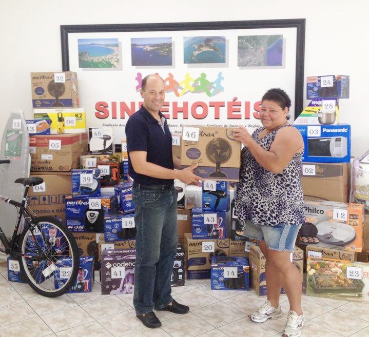 ILZA ANGELA DE ARAUJO da empresa Bodega Burger Shop de Itapema, recebendo um VENTILADOR, sorteado no dia 20/12/2016, das mãos de nosso presidente Eliseu Luis Casanova, na Sede em Itapema.