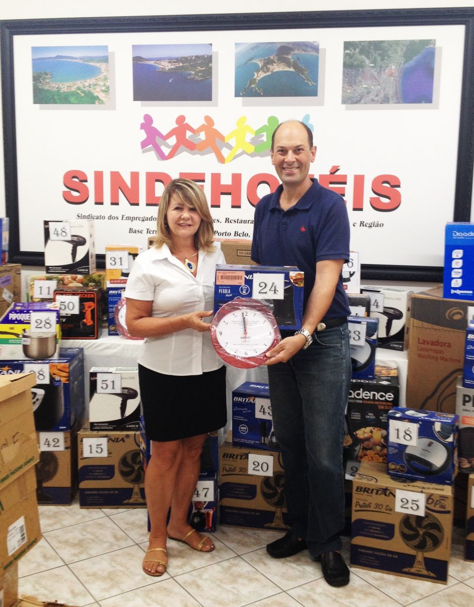 No dia de hoje (quarta feira - 25 de janeiro) IONE CARMEM ALIEVI ZANCHET do Hotel Enseada do bairro meia praia da cidade de Itapema, recebeu uma BATEDEIRA e um RELÓGIO PERSONALIZADO DO SINDICATO, sorteado no dia 20/12/2016, das mãos de nosso presidente Eliseu Luis Casanova, na Sede em Itapema.