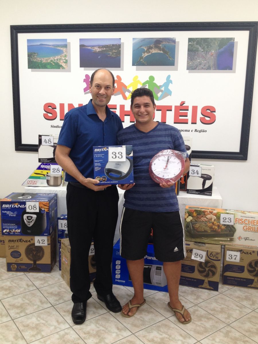 Presidente Eliseu Luis Casanova, entregando no dia 06 de janeiro de 2017 (segunda feira) entregou o prêmio na Sede Itapema a ODIRLEI FRANCISCO LAURENCO da empresa Pousada das Vieiras, do bairro Vila Nova da cidade Porto Belo, que foi contemplado com uma SANDUICHEIRA e um RELÓGIO PERSONALIZADO, sorteado no último dia 20/12/2016.