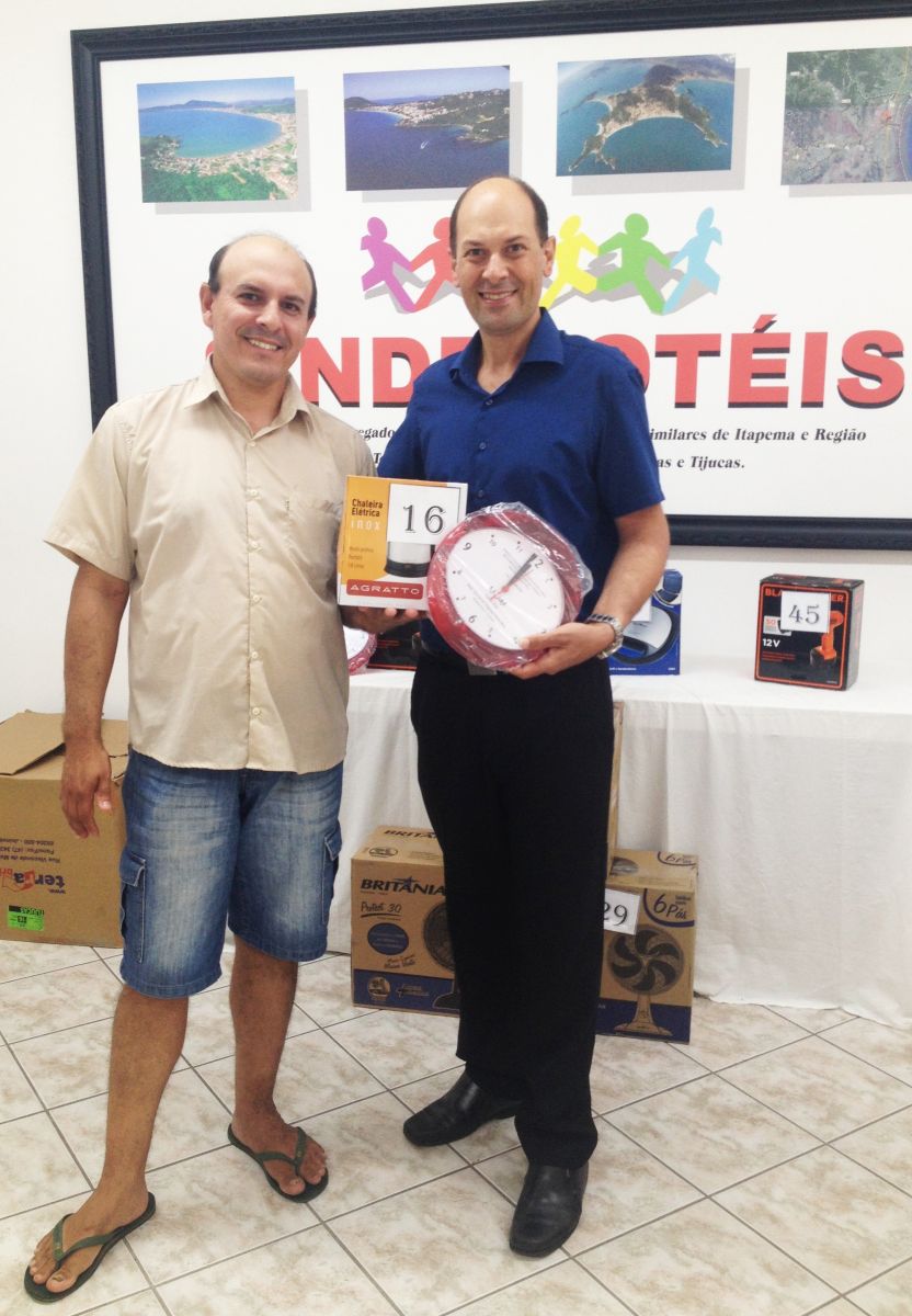 Presidente Eliseu Luis Casanova, entregando no dia 10 de fevereiro de 2017 (terça feira) o prêmio na Sede Itapema a FLAVIO DAMASCENO OLIVEIRA da empresa Restaurante Caseirinho, do centro da cidade Tijucas, que foi contemplado com uma CHALEIRA ELÉTRICA 1,8 litros e um RELÓGIO PERSONALIZADO, sorteado no último dia 20/12/2016.