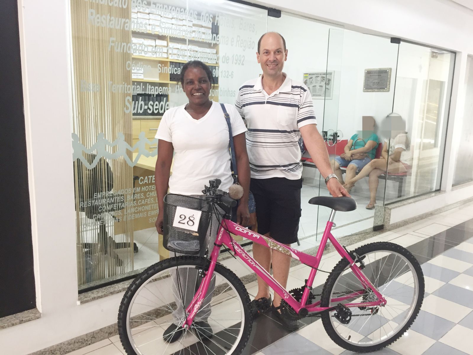 Nesta quarta feira de tarde (31 de janeiro) CLAUDETE FRANCISCO DA SILVA da empresa Pousada Villa Oceanica, do centro da cidade de Bombinhas, recebeu uma BICICLETA FEMININA A26 18M FREE ACTION, sorteada na atividade formativa de encerramento de final de ano 2017, na sede da entidade no dia 22/12/2017, das mãos de nosso presidente Eliseu Luis Casanova, na Sub Sede em Bombinhas.