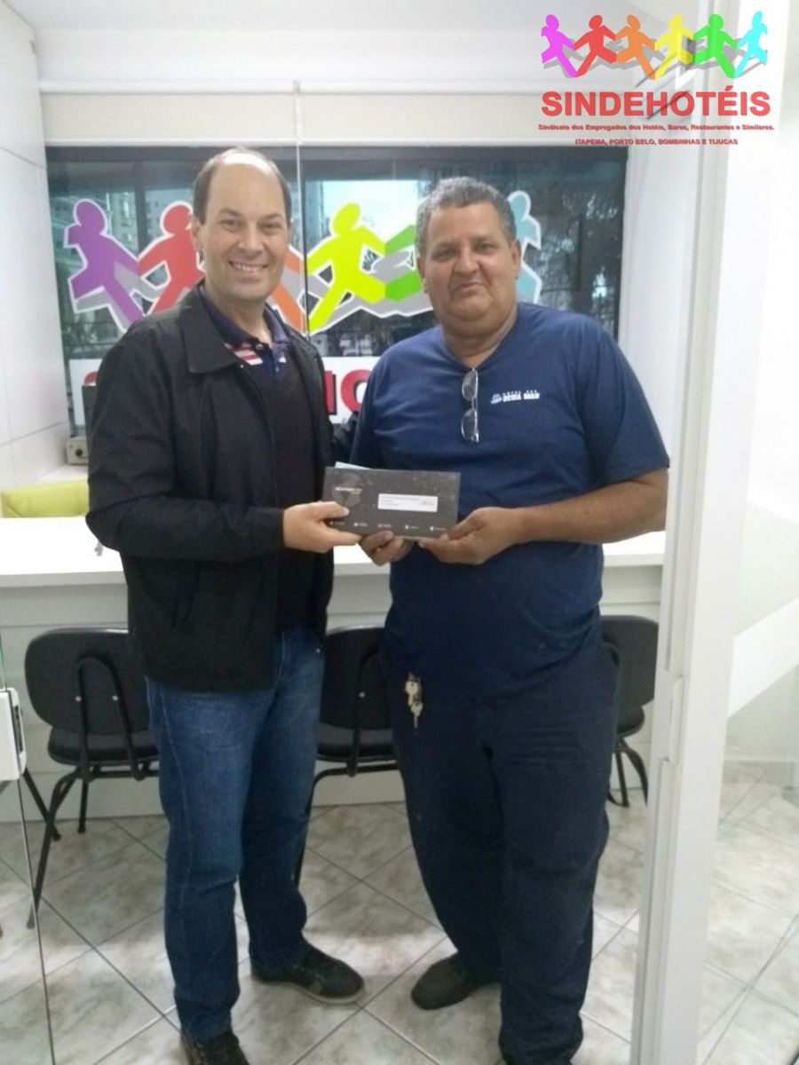 As primeiras carteirinhas com esta nova parceria já chegaram, e os associados de nosso sindicato, já estão vindo buscar para usufluir desta nova vantagem de descontos. Sérgio Fernandes Prudente da cidade de Itapema, recebeu das mãos do presidente Eliseu na Sede Itapema.