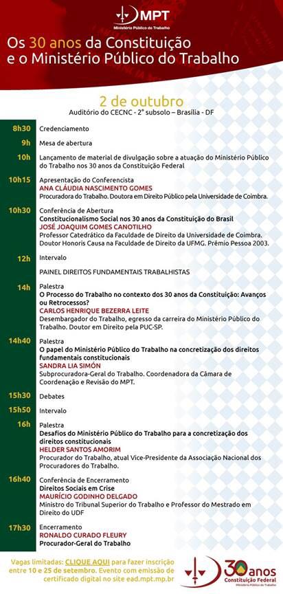 “O trigésimo aniversário da Constituição de 1988 é uma oportunidade para renovar e debater os ideais de Justiça e Cidadania Social, importantes para o Direito do Trabalho, que passa por um momento de crise”, destaca o procurador-geral do MPT, Ronaldo Fleury.