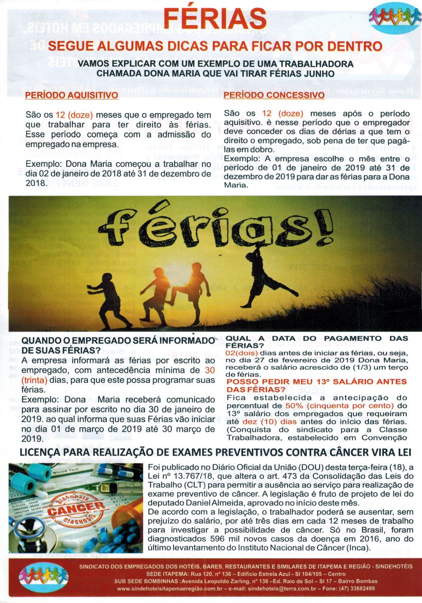 Neste mês de janeiro de 2019, foi distribuido pela categoria, como sempre fazemos nos municípios de Itapema, Porto Belo, Bombinhas e Tijucas este INFORMATIVO, que traz dicas sobre FÉRIAS (prazos e pagamentos), antecipação de 13º Salário (Direito adquirido em negociação da CCT para os trabalhadores) e Licença para realização de exames preventivos do contra câncer que virou lei, além de outras matérias, para o conhecimento de todos.