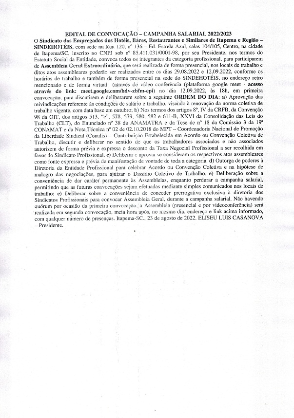 SINDICATO DOS EMPREGADOS DOS HOTÉIS, BARES, RESTAURANTES E SIMILARES DE ITAPEMA E REGIÃO – SINDEHOTÉIS, além da assembleia que acontecerá na Sede em Itapema, estará realizando também assembleias nos locais de trabalho, para discutirem e deliberarem, conforme edital abaixo, divulgado na publicação no dia 24 de agosto de 2022, no Jornal O Atlântico, pag.3, edição 6631, e neste site, além da divulgação nas empresas com os funcionários.