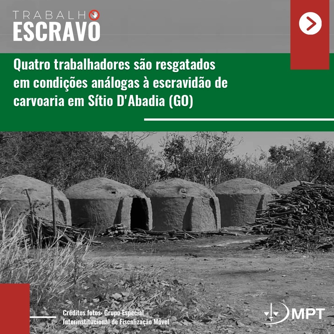 Quatro trabalhadores foram resgatados em condições análogas à escravidão em uma carvoaria do município de Sítio D´Abadia (GO). A fiscalização ocorreu no dia 1º de setembro e foi realizada por auditores-fiscais do Trabalho, vinculados ao Ministério do Trabalho e Previdência; por procuradores do Ministério Público do Trabalho (MPT); representantes da Defensoria Pública da União (DPU); e o apoio da Polícia Rodoviária Federal (PRF).