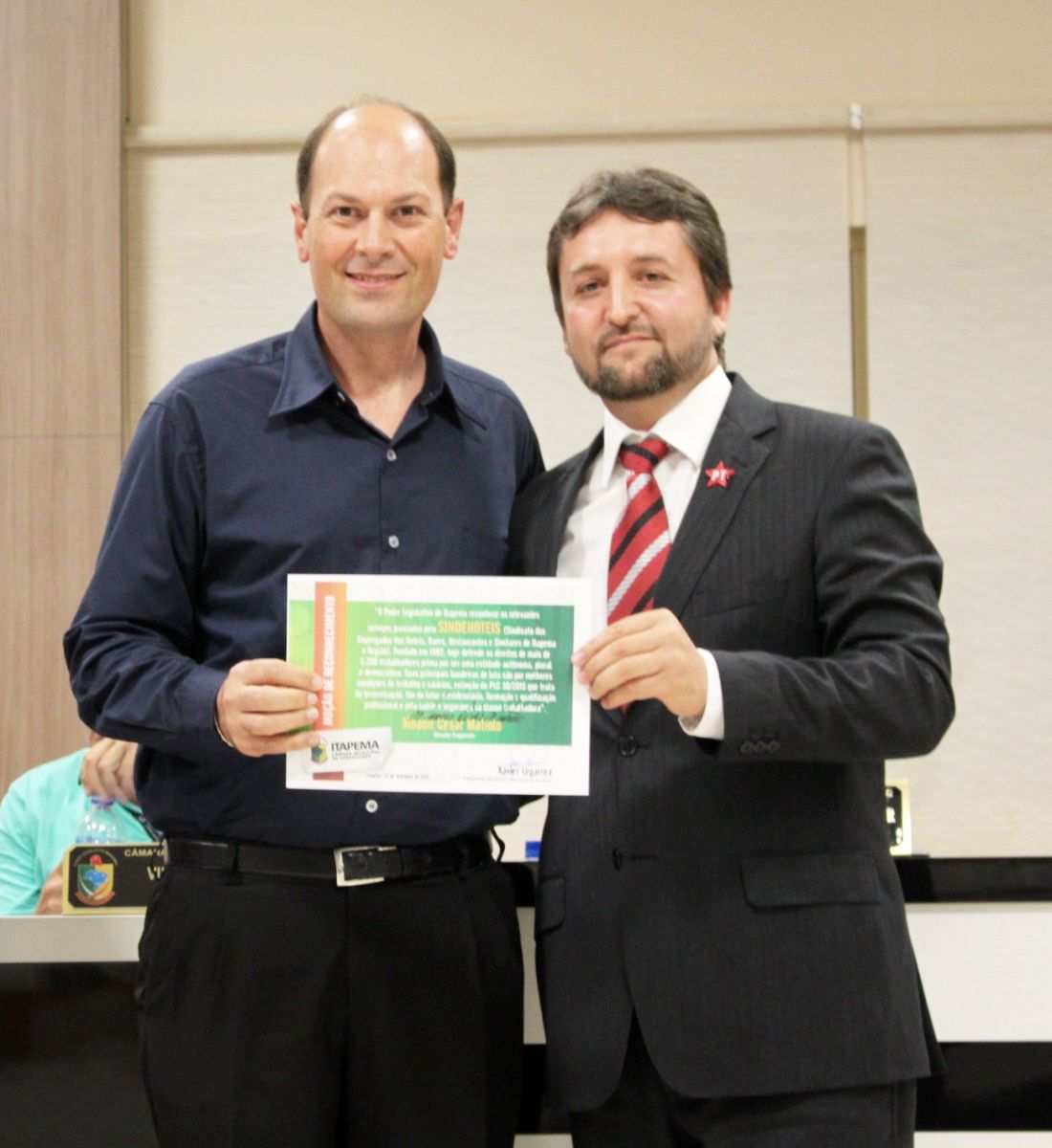 O Poder Legislativo de Itapema reconhece os relevantes serviços prestados pelo SINDEHOTEIS (Sindicato dos Empregados dos Hotéis, Bares, Restaurantes e Similares de Itapema e Região). Fundado em 1992, hoje defende os diretos de mais de 5.200 trabalhadores prima por ser uma entidade autônoma, plural e democrática. Suas principais bandeiras de luta são por melhores condições de trabalho e salários, extinção do PLC 30/2015 que trata de terceirização, fim do fator previdenciário, formação e qualificação profissional e pela saúde e segurança da classe trabalhadora.