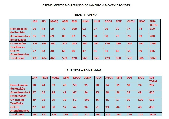 Durante este ano (janeiro a novembro 2015), o sindicato fez todo o possível para atender e orientar a categoria com a dignidade que ela merece. Na sede de Itapema foram realizados quase 6 mil atendimentos e na subsede de Bombinhas, 1.836 pessoas receberam orientação do Sindicato. “A cada ano vemos que os companheiros e companheiras procuram a entidade não somente para fazer seus cálculos trabalhistas em sua dispensa da emprea, mas também na admissão na empresa para orientar de seus direitos no decorrer do seu contrato de trabalho. No ano 2016 virá com muitas novidades, além de sempre estarmos juntos na luta por melhores salários e condições de trabalho para categoria”, adianta o presidente do Sindehotéis, Eliseu Luís Casanova.