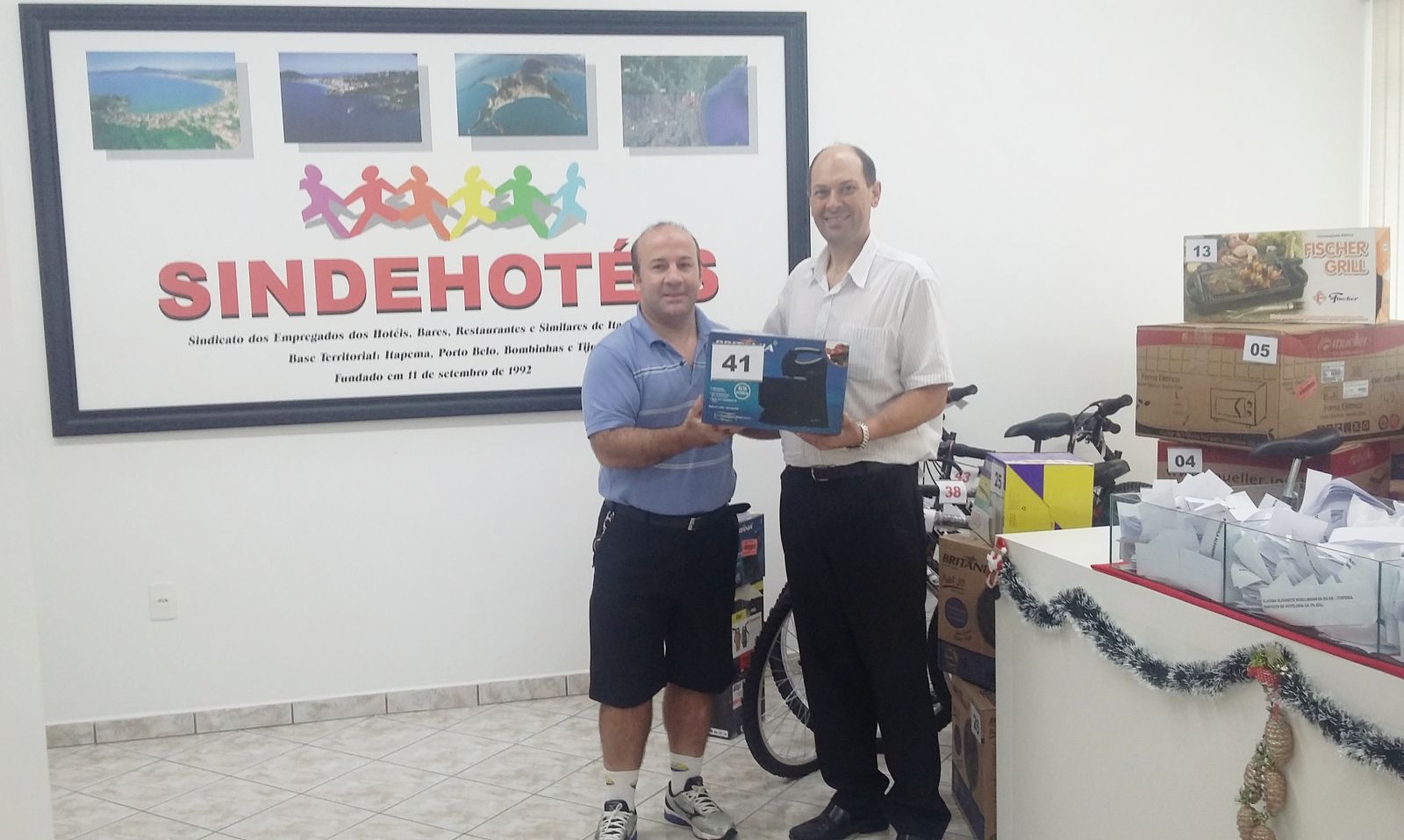 Nesta terça-feira (22/12/2015) veio nos visitar na Sede do sindicato em Itapema, o companheiro Irineu Mafra, funcionário da empresa Rest. e Pizzaria Alberto's, da cidade de Itapema, contemplado com uma BATEDEIRA, no sorteio do dia 21 de dezembro de 2015, que recebeu do Presidente Eliseu Luis Casanova.
