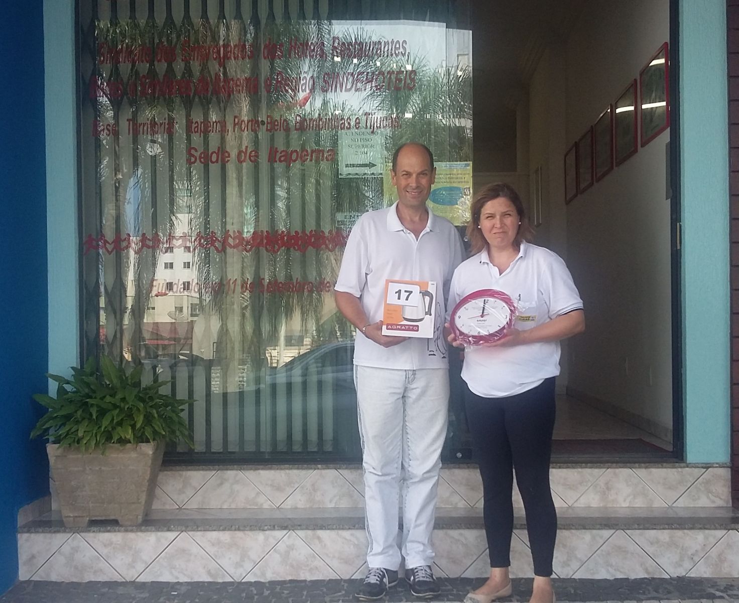 No dia 11 de fevereiro veio nos visitar na Sede do sindicato em Itapema, a companheira NEIVA APARECIDA DUARTE GONÇALVES, funcionária do Motel Luxor, da cidade de Itapema, contemplada com uma CHALEIRA ELÉTRICA, no sorteio do dia 21 de dezembro de 2015, que recebeu das mãos do presidente do sindicato Eliseu Luis Casanova o brinde.