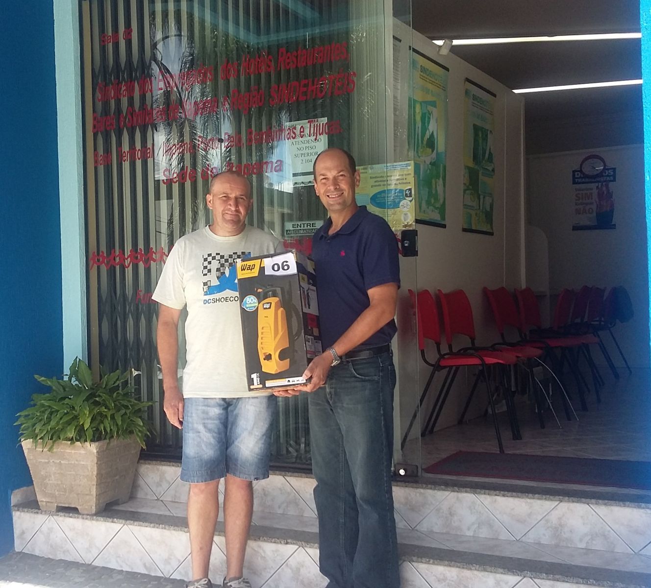 No 12 de fevereiro de 2016 veio nos visitar na Sede do sindicato em Itapema, o companheiro PEDRO SCHAEFER, funcionário do Bombinhas Tourist Hotel da cidade de Bombinhas, contemplado com um LAVA JATO WAP, no sorteio do dia 21 de dezembro de 2015, ao qual recebeu de nosso Presidente Eliseu Luis Casanova.