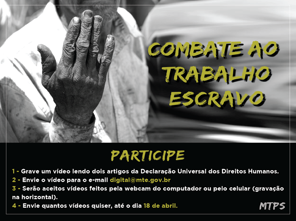 Qualquer pessoa pode participar. Basta gravar, em vídeo, artigos da Declaração Universal dos Direitos Humanos (abaixo) e enviar, até o dia 18 de abril, para o e-mail digital@mte.gov.br. A gravação pode ser em câmera profissional, de computador ou celular, desde que seja no sentido horizontal e siga exatamente o que diz o texto da Declaração. Os vídeos selecionados serão usados na campanha de combate ao trabalho escravo do governo federal. São aceitos mais de um vídeo por participante.