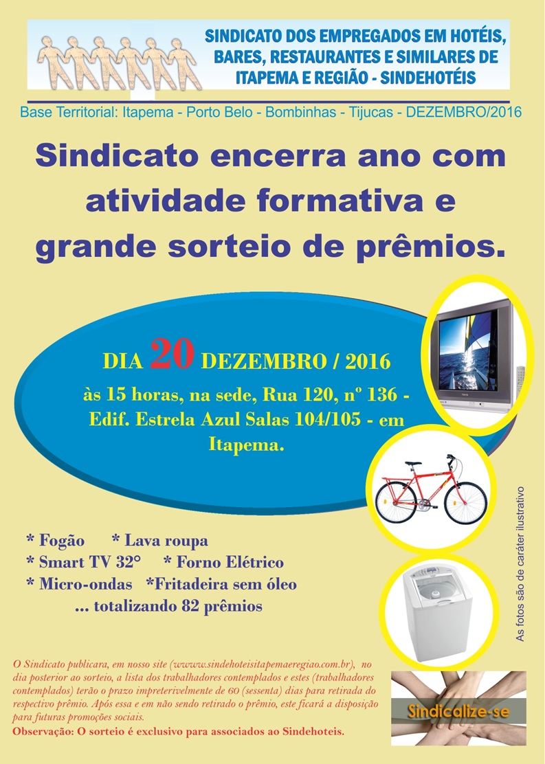 Pelo TERCEIRO ANO CONSECUTIVO o Sindicato dos Empregados em Hotéis, Bares, Restaurantes e Similares de Itapema, Porto Belo, Bombinhas e Tijucas, PROMOVE no dia 20 de DEZEMBRO, ATIVIDADE FORMATIVA E GRANDE SORTEIOS DE PRÊMIOS entre os trabalhadores associados. O evento é para celebrar o Natal e o Ano Novo e acontece às 15 horas, na sede da entidade (Rua 120, número 136, Edifício Estrela Azul, Sala 104/105). Serão sorteados os seguintes prêmios: smart TV 32 polegadas, máquina de lavar roupa, secadoras de roupas, tábua de passar roupa, ferro a vapor, fogão de 4 bocas, micro ondas, forno elétrico, aspirador de pó, bicicletas, fritadeira sem óleo, panificadora multi pani, edredon, grill jumbo inóx, churrasqueiras elétrica, grill sanduicheiras, lava jato, rádio mp3/usb, ventiladores, liquificadores, batedeiras, chaleiras elétrica, cafeteira elétrica, pipoqueira, furadeira, parafusadeiras, secadores de cabelo e relógios personalizados de parede do sindicato. O Sindicato publicará aqui no site (www.sindehoteisitapemaeregiao.com.br), no dia posterior ao sorteio, a lista dos trabalhadores contemplados e estes (trabalhadores contemplados) terão o prazo impreterivelmente de 60 (sessenta) dias para retirada do respectivo prêmio na Sede do sindicato em Itapema, com a apresentação da Carteira de Trabalho. Após essa e, não sendo retirado o prêmio, este ficará a disposição para futuras promoções sociais.