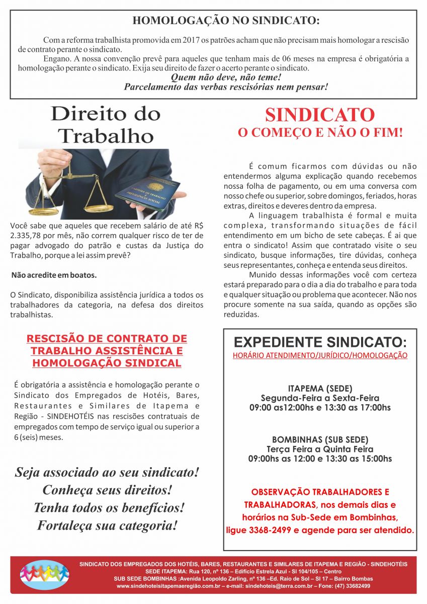 Lembramos aos funcionários da categoria de hotéis, pousadas, bares, restaurantes e similares de Itapema, Porto Belo, Bombinhas e Tijucas, que sua RESCISÃO DE CONTRATO DE TRABALHO acima de 06 (SEIS) MESES, quando você sai da empresa, tem que ser feita no sindicato, caso não seja, venha conversar conosco.
