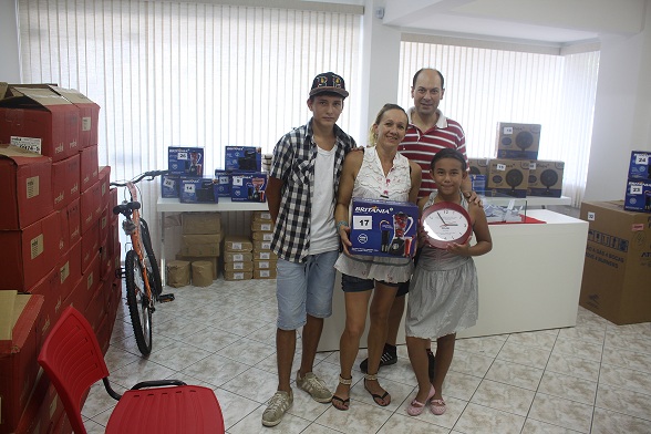 Presidente Eliseu Luis Casanova, entregou nesta quinta feira (08/01/2015), um LIQUIDIFICADOR E RELOGIO a ANGELITA APARECIDA BACHMANN, do Restaurante Vieiras da cidade de Itapema, que relatou que este ano começou com o pé direito, ganhando este prêmio. Feliz da vida, trouxe junto seus filhos.