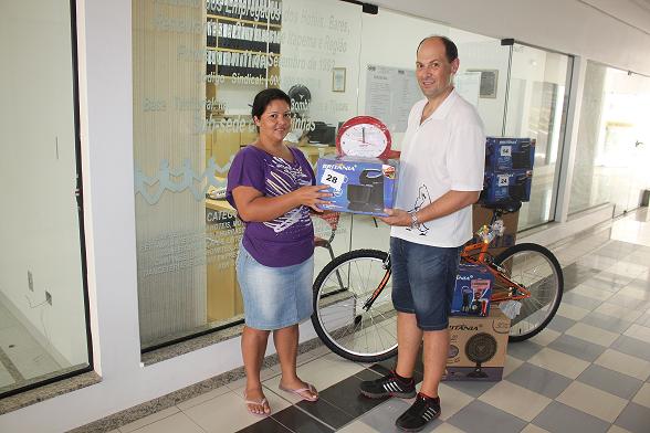 Presidente Eliseu Luis Casanova, entregando brindes na Sub Sede Bombinhas a IVONETE MORAES FERNANDES da empresa Pousada Caracol II da cidade Bombinhas, que foi contemplado com uma BATEDEIRA E RELÓGIO, sorteado no último dia 22/12/2014.