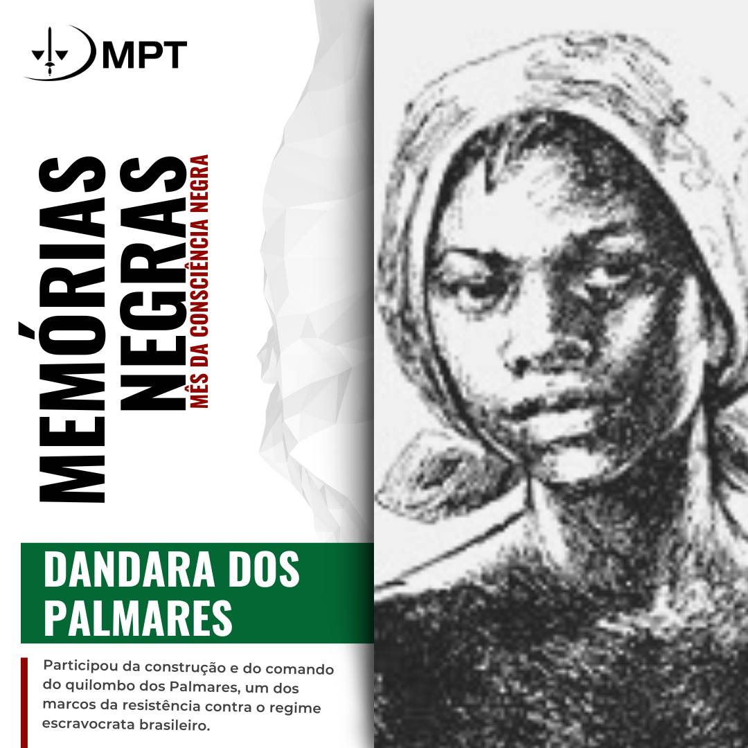 A campanha Memórias Negras faz uma homenagem a 15 personalidades que marcaram a história do Brasil. A ação, promovida pelo Ministério Público do Trabalho nas redes sociais, propõe uma reflexão sobre a importância da contribuição de homens e mulheres negros e negras para a ciência, a cultura, as artes, a educação, os esportes, dando visibilidade a grandes expoentes da nossa história, bem como, propõe chamar a sociedade para pensar sobre a desigualdade, a violência e o racismo estrutural existente no país. Neste post, conheça Dandara dos Palmares, companheira de Zumbi dos Palmares, um dos principais nomes da luta contra escravidão no Brasil.