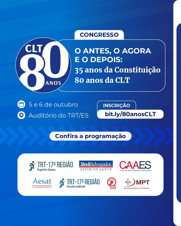 Seminário em comemoração aos 80 anos da CLT ocorre nesta quinta em Vitória (ES)